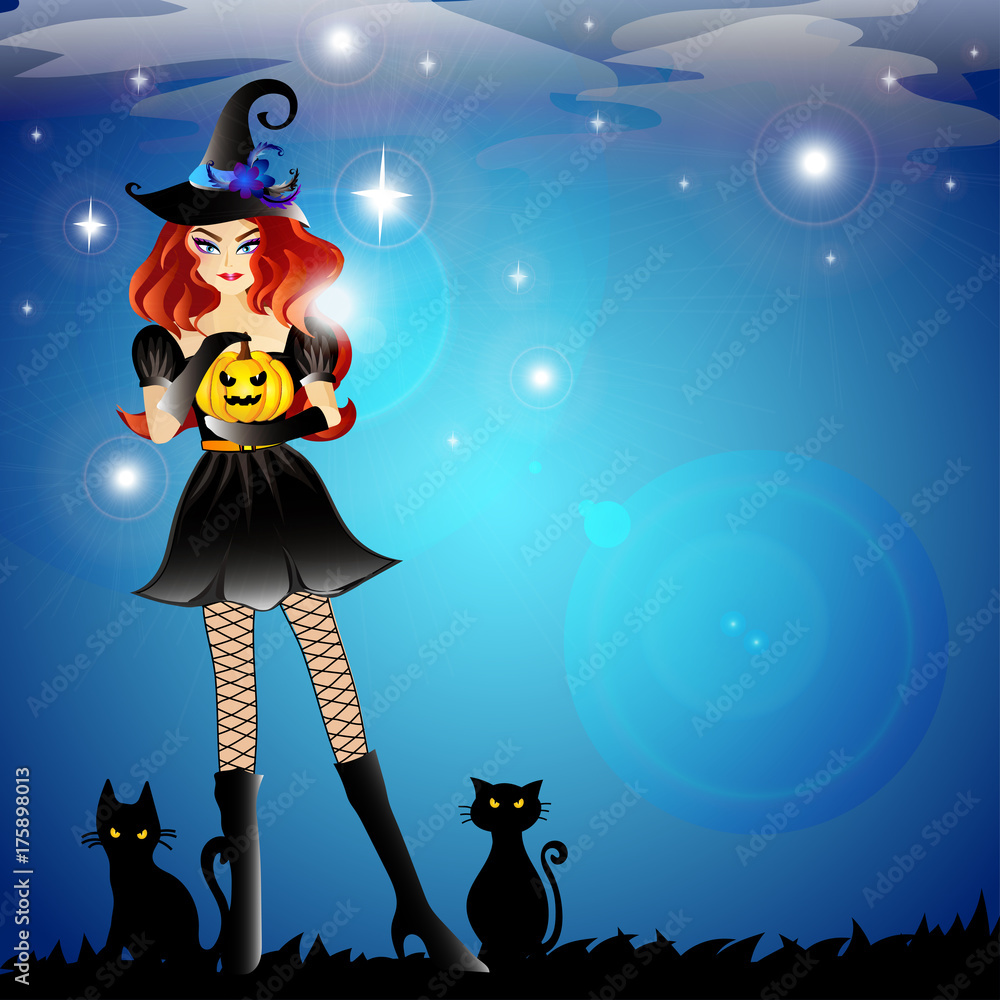 Halloween Theme Party Girl With Black Color Witch Dress And Black Witch Hat Stand On Night Flare Star Lights Sky With Black Cats Stock Vector Adobe Stock